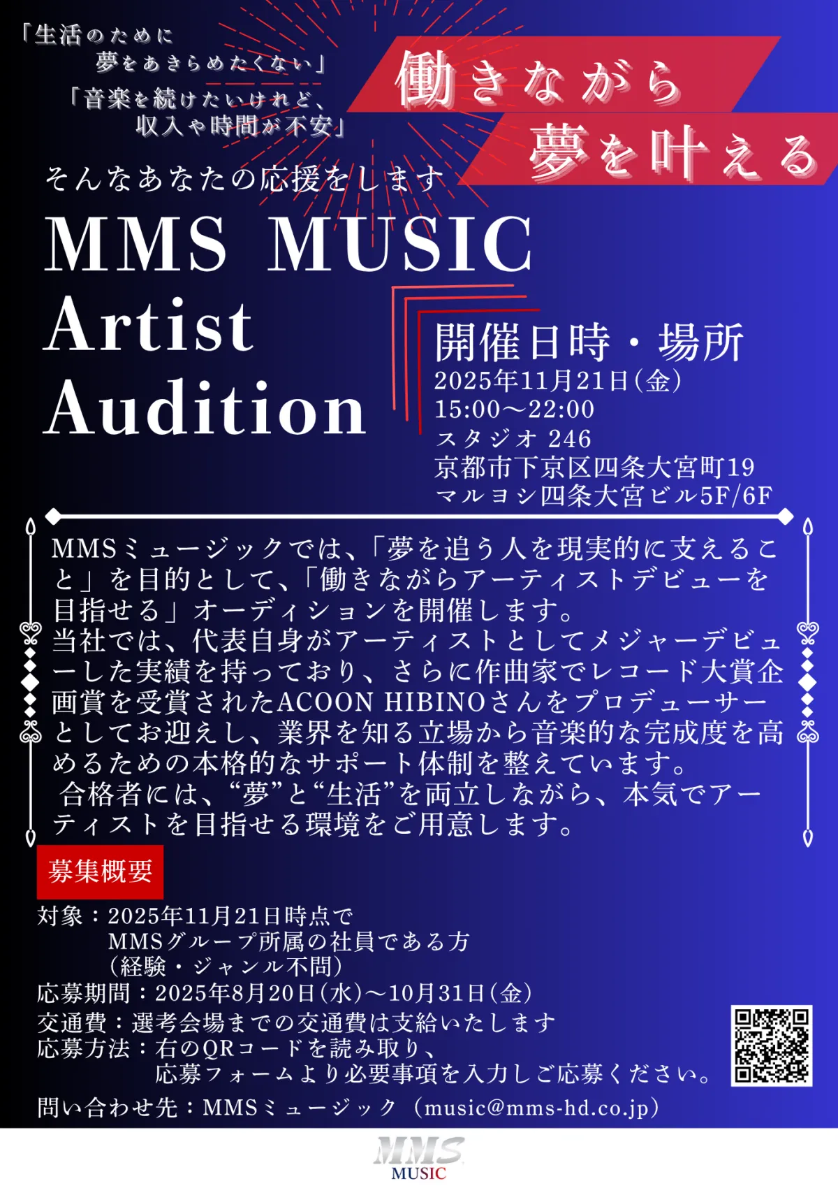 株式会社MMSホールディングスは、社員が夢を追求するための新たな取り組みとして、アーティストデビューを目指すオーディションを開催します。このオーディションは、単なる音楽コンテストではなく、社員が「働きながら夢を実現できる」場を提供することを目的としています。