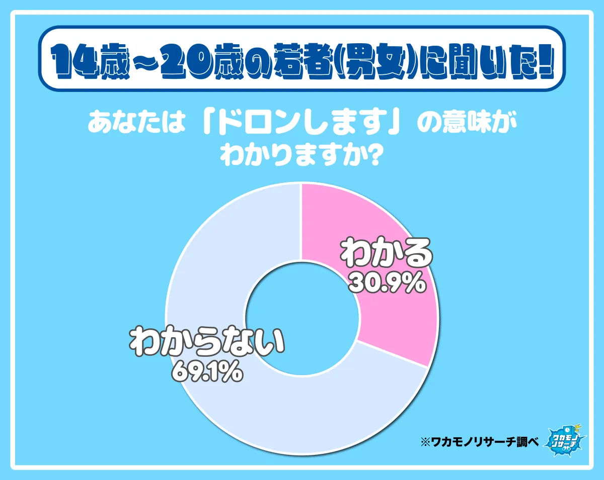 マーケティング情報サイト「ワカモノリサーチ」によって行われたアンケート調査において、全国の14歳から20歳の若者935名を対象に、「あなたは“ドロンします”の意味がわかりますか?」との質問が投げかけられました。その結果、約30.9%の若者が「わかる」と回答し、69.1%が「わからない」と答えました。