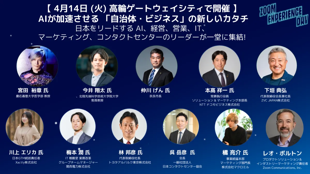 「Zoom Experience Day2026」は、ZVC JAPAN株式会社が主催するリアルイベントです。本イベントのテーマは「コミュニケーションが社会インフラに - AIが会話を行動へ導く」です。奈良市長を始めとする自治体関係者や民間企業の代表が集まり、AIがもたらすコミュニケーションの変革について議論されます。さらに、顧客体験(CX)や従業員体験(EX)の向上に関する事例も紹介され、参加者同士のネットワーキングの場も設けられます。