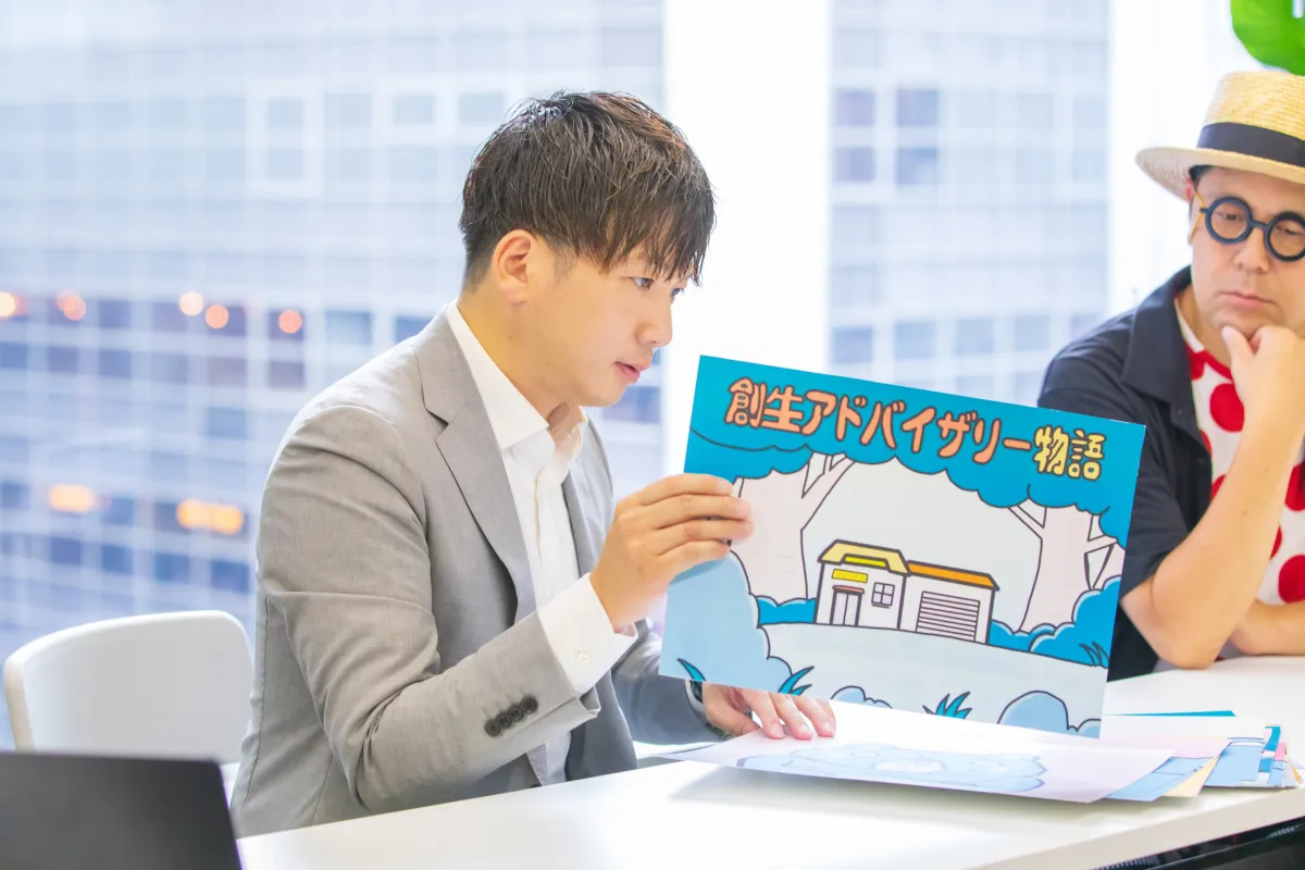 創生アドバイザリーの本プロジェクトでは、紙芝居を「企業支援の伝達ツール」として採用。子ども向けのイメージが強い紙芝居ですが、その利点を活かし、経営者や社員、そして地域の人々に「伝えること」の重要性を届けようとしています。
