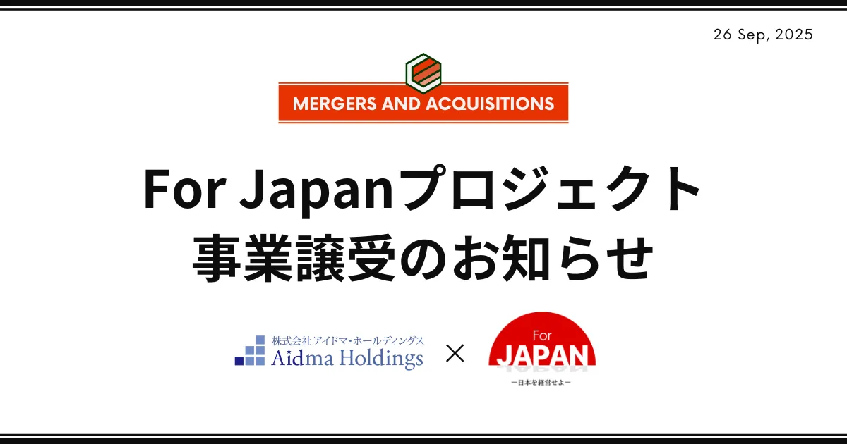 株式会社アイドマ・ホールディングス(以下、アイドマHD)は、絆ホールディングス株式会社から「For JAPANプロジェクト」の事業を譲受けることになりました。この譲受は、2025年9月26日付けで行われる予定です。