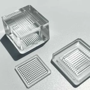 もう一つの注目製品、一体成型の両面レンズアレイは、従来の2枚使いのレンズに比べて調整が不要です。そのため、ハイパワー光源であるレーザーでも安心して使用できます。2mmから20mmのバリエーションが可能で、既に半導体製造装置や蛍光顕微鏡などで採用されています。