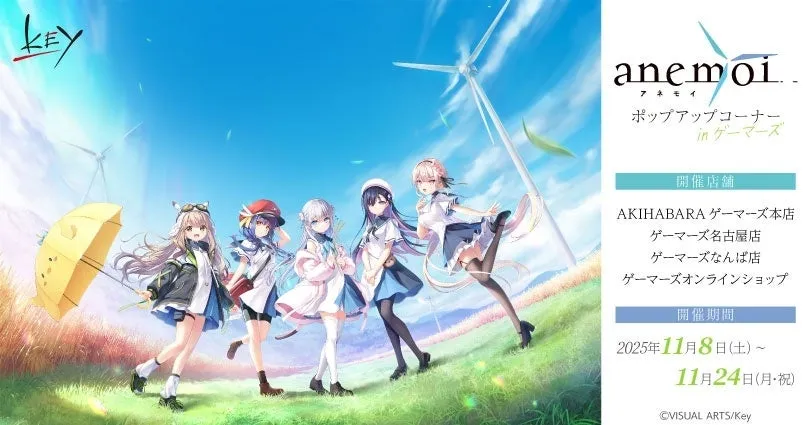 2025年11月8日(土)から11月24日(月・祝)までの期間、ゲーマーズ各店にて『anemoi』ポップアップコーナーが特別に開催されます。このイベントは、新作グッズを販売するだけでなく、購入者には嬉しい特典も用意されているため、ぜひお見逃しなく!