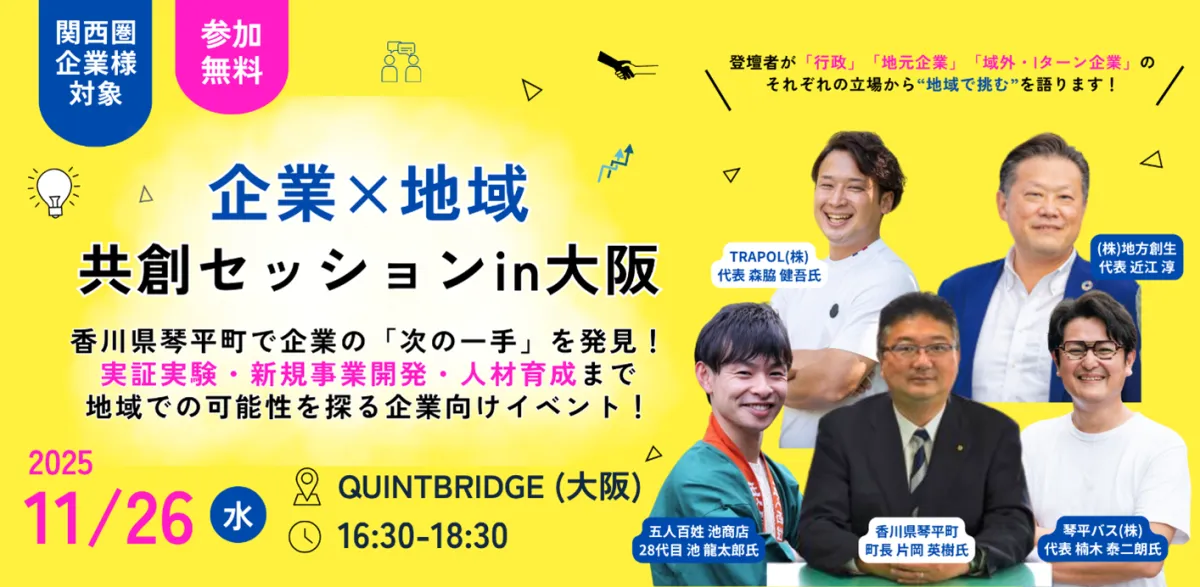 夢のある取り組みが進む琴平町から、企業と地域が共に作り出す未来の姿が、共創セッションを通じて描かれることでしょう。地域の可能性を広げるこの機会に、ぜひご参加ください。