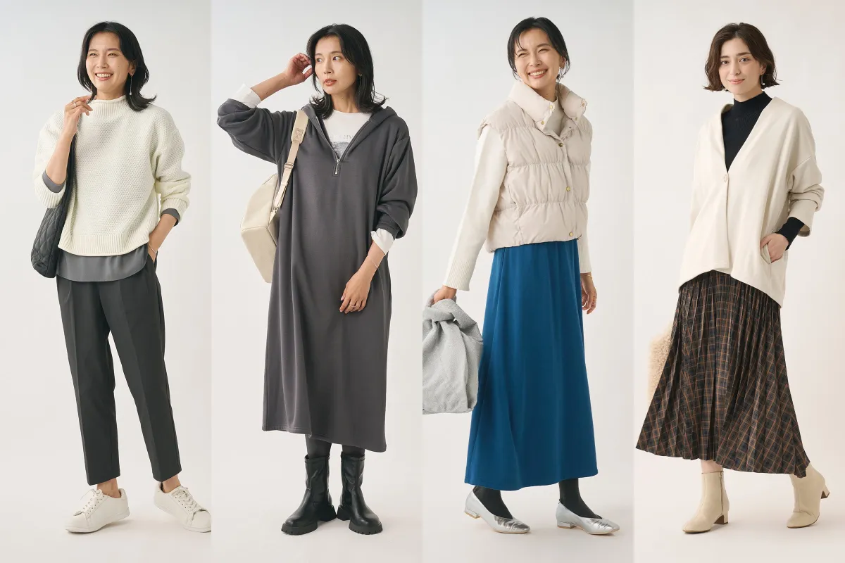 一枚でスタイリングが決まるこのワンピースは、フード付きで首元も温か。「ハーフジップ」のデザインが今年らしさを打ち出し、大人女性にぴったりの仕上がりです。