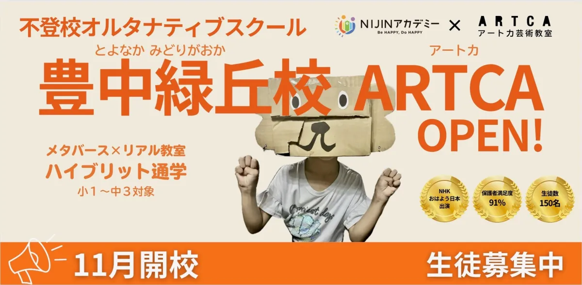 2025年11月4日、大阪府豊中市に不登校の子どもたちを支える新しい学びの場所が誕生します。それが、「NIJINアカデミー豊中緑丘校|ARTCA」です。このオルタナティブスクールは、アートに特化した教育を通じて、子どもたちが自己表現をしながら学べる環境を提供します。