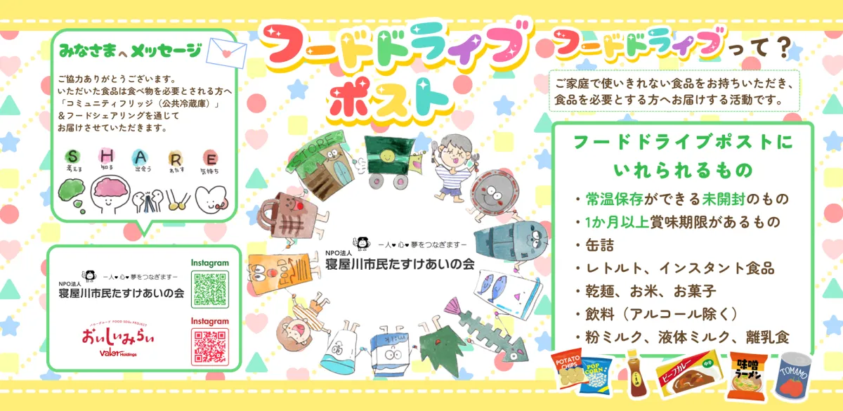 このフードドライブポストを利用するのはとても簡単です。買い物のついでに家庭に余っている未開封で賞味期限が1ヶ月以上残っている常温保存可能な食品を寄贈することで、自分も「フードレスキュー」に参加できます。寄贈された食品は、寝屋川コミュニティフリッジを通じて、ひとり親家庭など支援が必要な家庭に届けられます。