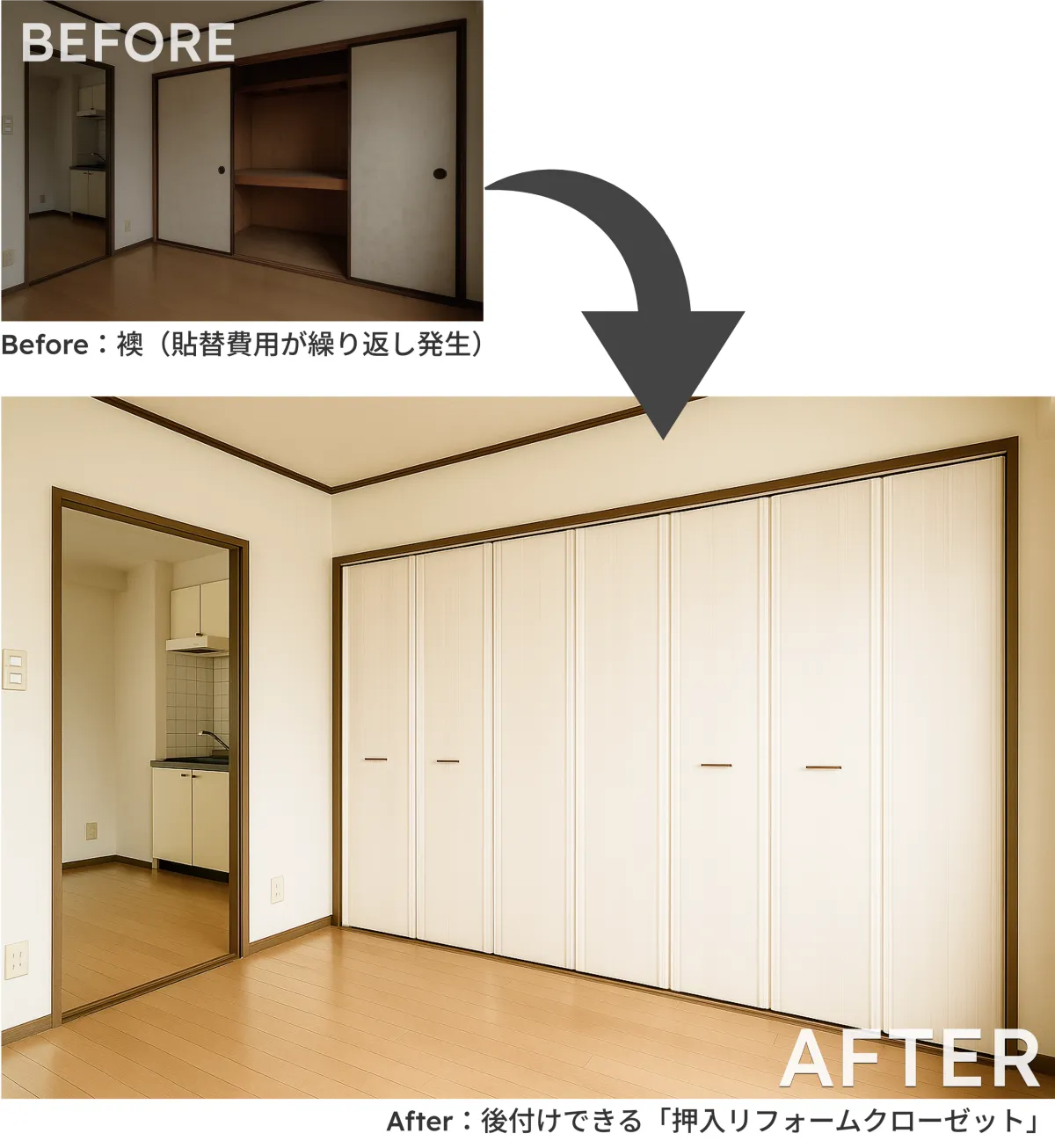 扉を交換すると、ただ見栄えが良くなるだけでなく、収納量も増やせるメリットがあります。特に押入れをクローゼット化することで、機能性が格段に向上します。これにより、若年層のニーズに応え、申し込み率の向上につながります。また、内見時の第一印象も改善され、賃貸物件の競争力が高まります。