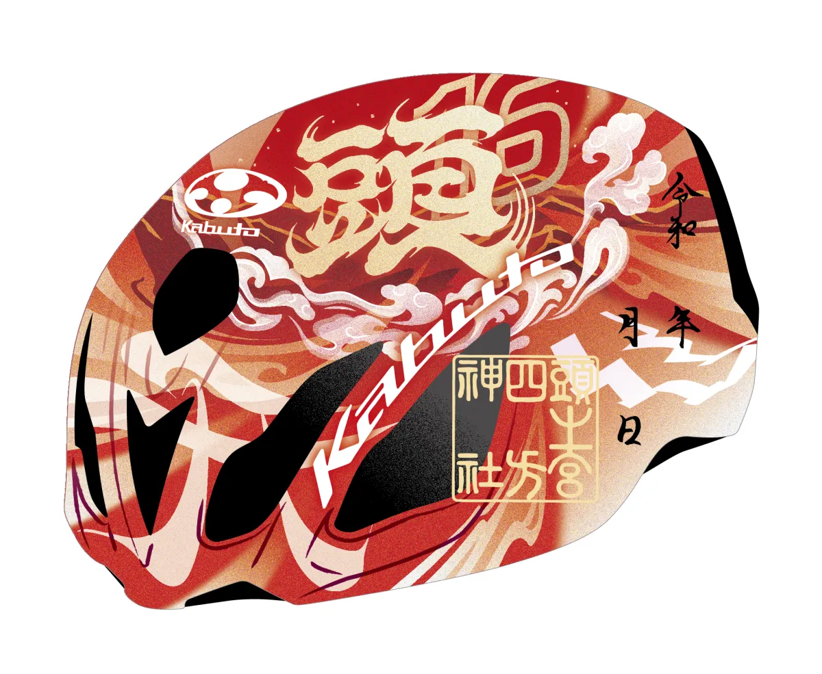 この御朱印は、オージーケーカブトの高性能トラック競技用ヘルメット「AERO-R2」のデザインを反映しています。御朱印には「トップ」「頭」「一歩ずつ自分を更新」というメッセージが込められており、サイクリストの心意気を象徴します。自分自身に挑戦し続けること、その先にある成長を見据えたメッセージは、サイクリストたちを鼓舞するものです。