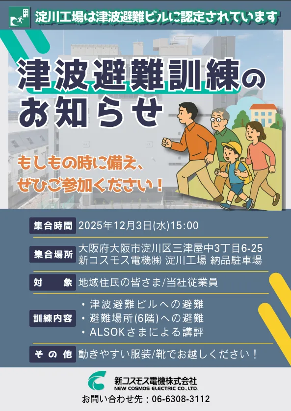 2025年12月3日(水)、新コスモス電機株式会社が大阪市淀川区に位置する淀川工場で、「津波避難訓練」を初めて行います。この訓練は、大阪府内で発生する可能性のある大規模地震に伴う津波警報を想定したもので、地域住民と同社従業員の防災意識を高めることを目的としています。